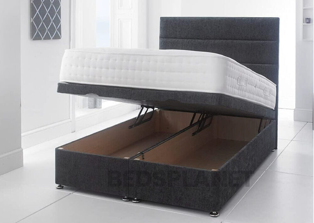 Black Suede Divan Bed With Gas Lift and Mattress