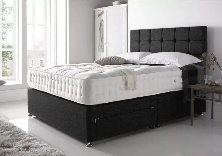 Linen Grey Divan Bed With Cube Headboard and Mattress