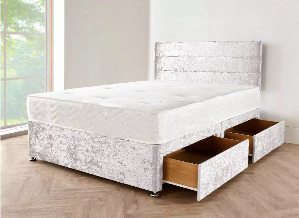 5FT Kingsize Silver Crushed Divan Bed with Mattress, Headboard and 2 Storage Drawers on Sale