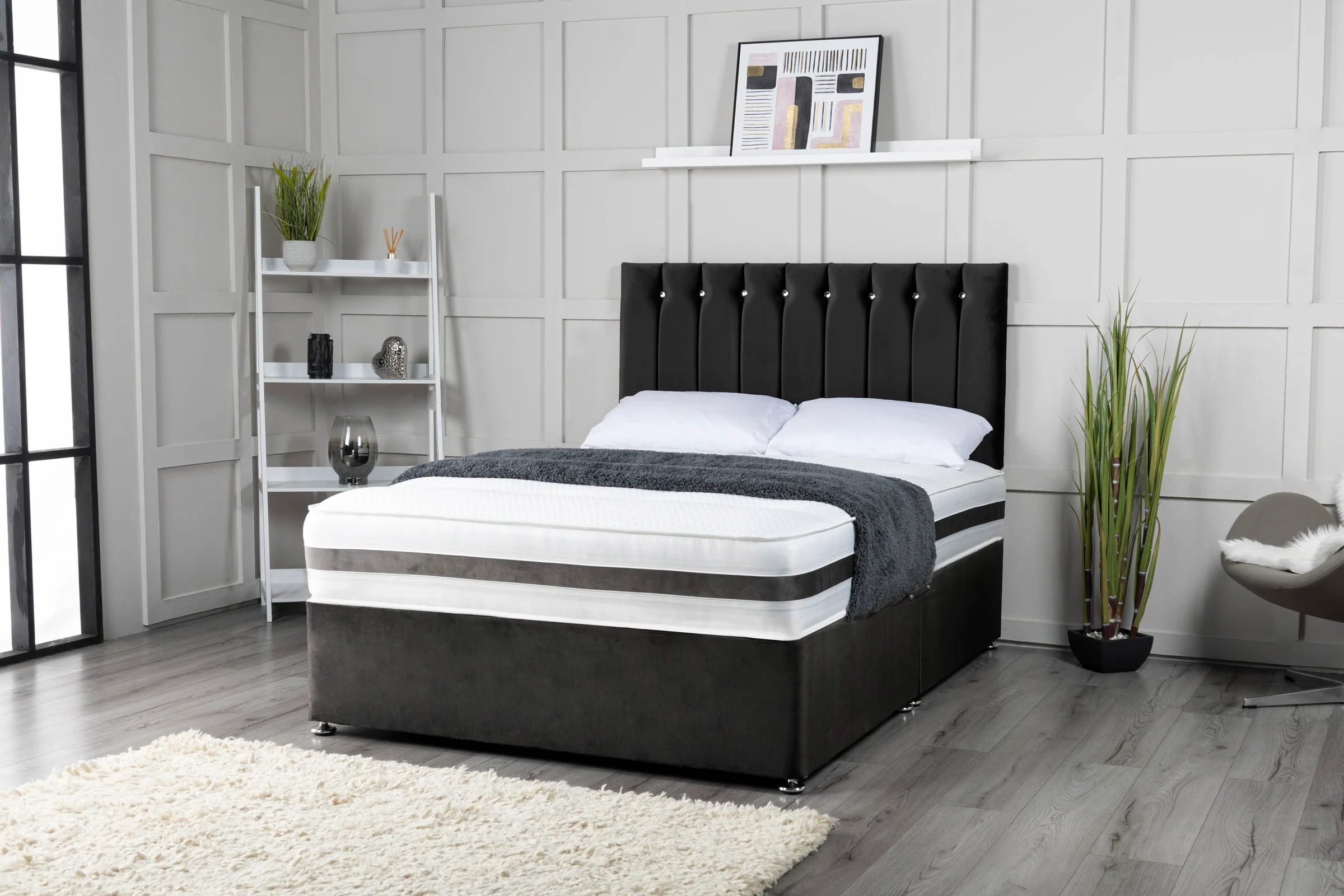 Crushed Velvet Black Divan Bed With Vertical Headboard