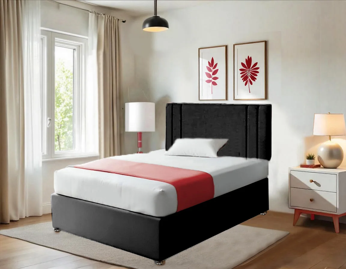 Crushed Velvet Black Divan Bed With Vertical Headboard